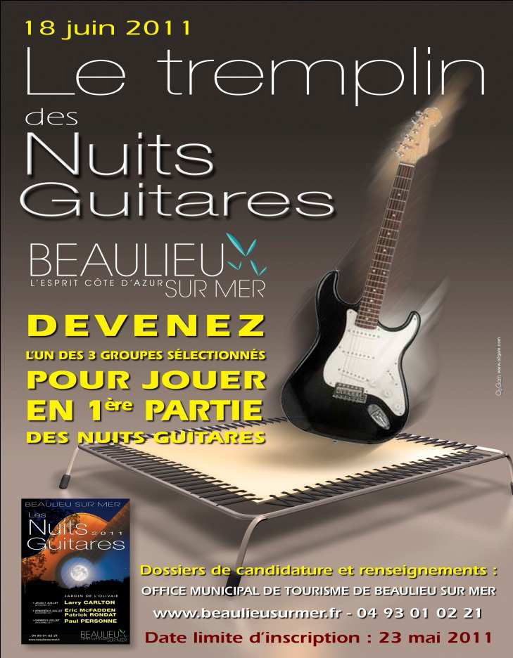Le Tremplin « Nuits Guitares » se déroulera ainsi en public le Samedi 18 Juin 2011 de 15h à minuit place Marinoni (entrée libre). Le Tremplin « Nuits Guitares » est ouvert à toutes formations, groupes ou individus, non signés auprès de Labels et/ou Maisons de disques et qui se définissent comme interprètes de musique Blues, Rock, Alternative.