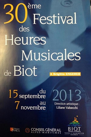 Le Festival des Heures Musicales de Biot fête cette année son 30ème anniversaire. C’est donc avec une exigence de qualité toute particulière que la responsable artistique, Liliane Valsecchi, a sélectionné une programmation exceptionnelle. D’autant plus que le Festival retrouve sa place dans la merveilleuse Eglise de Biot, après une fermeture durant un certain temps pour travaux.