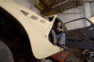 Claude qui pilote lui-même une Volvo P 1800 S de 1969 -le célèbre coupé immaculé de Simon Templar (le Saint)- n’a pas son pareil pour refaire une virginité à ces vieilles gloires de l’asphalte. Sur le « pont billard » on opère aujourd’hui un break en bois de 1934, une Renault VivaStella dans son jus d’origine. Claude évolue désormais en solo aidé d’un jeune apprenti, afin de donner corps à ses rêves mécaniques comme à ceux de tous les collectionneurs ou fans de customisation qui viennent parfois de très loin avec leur précieux butin. Et le protocole est toujours le même : « on passe d’abord par une préfiguration de l’engin en 3D avant d’entamer le gros œuvre. La seule limite, c’est l’argent ! Ce n’est qu’après un brainstorming avec le client que j’assure le suivi du modèle, de la création (design, ergonomie) à sa conception (mise en plan, calcul de structure, choix des matières et processus de mise en œuvre) jusqu’à la mise en production ». Une étape qui contraint parfois notre ingénieur à refaçonner lui même certaines pièces ou outils obsolètes, voire quand un morceau du puzzle s’avère introuvable, à le faire usiner.