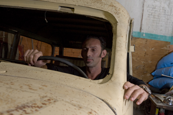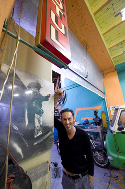 Pas très développement durable tout çela me direz-vous ! Et pourtant c’est au cœur de ce pandémonium où trônent d’emblématique oriflammes de l’énergie fossile, comme cette vieille enseigne au néon MOTUL, que pourrait bien surgir la voiture écologique de demain ! Claude qui joue les Léonard de Vinci en créant par ailleurs d’incroyables engins de glisse, des nacelles, s’est fait la main à plusieurs reprises sur des races hybrides de véhicules comme en témoigne ce squelette de prototype accroché aux murs telle une araignée.