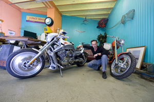 Aussi « débrider » les japonaises ou cuisiner l’Harley Davidson à la sauce grand veneur, c’est le plat du jour de Claude dont les yeux s’allument comme des phares de Pontiac lorsqu’il s’agit de relever un défi ! Pour l’anecdote la fameuse Blue Steel 1600 CC offerte par Laëtitia à Johnny Hallyday pour son anniversaire, c’est lui : « 853 heures de main d’œuvre, un mois et demi de travail non stop, pour être à l’heure. Nous avons même créé une teinte mêlant la couleur des yeux de Johnny et de ceux de sa fille ». Voilà le genre de pari que l’on aime prendre chez Vortex qu’il s’agisse d’Harley, de Norton, Triumph, ou roadster radicaux relookés de A à Z.
