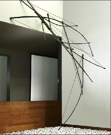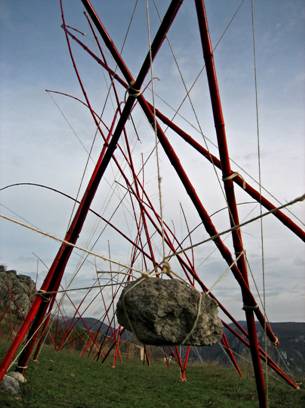 Bernard Abril, artiste cannois, travaille dans la mouvance de l’Arte Povera. Il questionne le rapport à la nature en produisant des structures fragiles et éphémères, la plupart du temps assemblages de matériaux naturels tel que le bambou ou les cordes de chanvre.