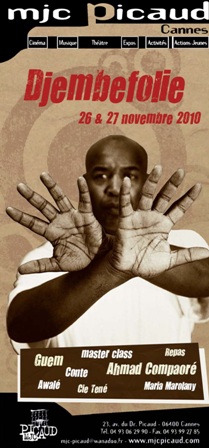 Deux jours à vivre en toute convivialité au rythme des Djembé et de l’Afrique. De la musique avec Ahmad Compaoré, Guem, Maria Marolany & Co’, de la Danse avec la Cie Tené, une Master Class de Percussion avec Guem, un stage de danse africaine, des ateliers de maquillage, coloriage pour les enfants, des contes, un repas traditionnel africain concocté par l’association Héphaïstos, du cinema avec la projection de Benda Bilili et bien sûr la clôture de la manifestation avec le fameux bœuf africain djembefolie !!!!