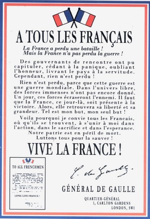 raison, l’Appel est aussi un message d’espoir pour une Nation vaincue et abattue par la défaite. En appelant les Français à poursuivre la lutte aux côtés des Alliés et en maintenant la France dans la guerre, le général de Gaulle préserve l’honneur du pays, mais aussi ses intérêts : à l’heure de la victoire, le 8 mai 1945, la France siège avec les vainqueurs de la Seconde Guerre mondiale et recueille la capitulation de l’Allemagne nazie. Conséquence de cet engagement aux côtés des Alliés, la France obtient en 1946 un siège de membre permanent du Conseil de Sécurité des Nations Unies et retrouve son rang sur la scène internationale.