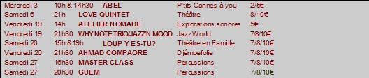 En ce mois de Novembre la MJC Picaud proposera des spectacles pour tous : au programme, du théâtre, du Jazz, des Musiques Actuelles, des spectacles pour enfants et notre rendez-vous annuel de Djembefolie !!!