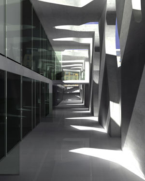 C’est pourquoi son bâtiment se veut « chargé de mystère, se laissant découvrir peu à peu », enserré qu’il est dans une sorte de filet fait de colonnes de formes « aléatoires », ondulantes. Dès l’entrée du musée, « le visiteur devinera la salle d’exposition permanente sans la voir derrière une grande paroi de verre translucide sérigraphié ».