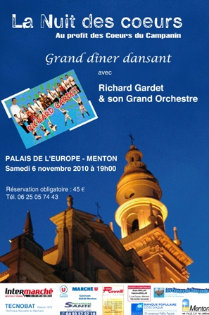 Menton vous invite à un grand Dîner dansant avec Richard Gardet et son Grand Orchestre au profit des « CŒURS DU CAMPANIN » avec le soutien de la ville de Menton.