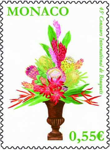 Présidé par S.A.R. la Princesse de Hanovre, le Concours International de Bouquets réunit chaque année entre 100 et 150 participants. La 45e édition se déroulera les 5 et 6 mai 2012 sur les Terrasses du Casino. En référence au concours 2011 placé sous le thème de l’Afrique du Sud, le timbre illustre un bouquet composé de protea, plantes typiques de ce pays. La 5e Exposition Féline Mondiale se déroulera à l’Auditorium Rainier III les 11 et 12 février 2012.
