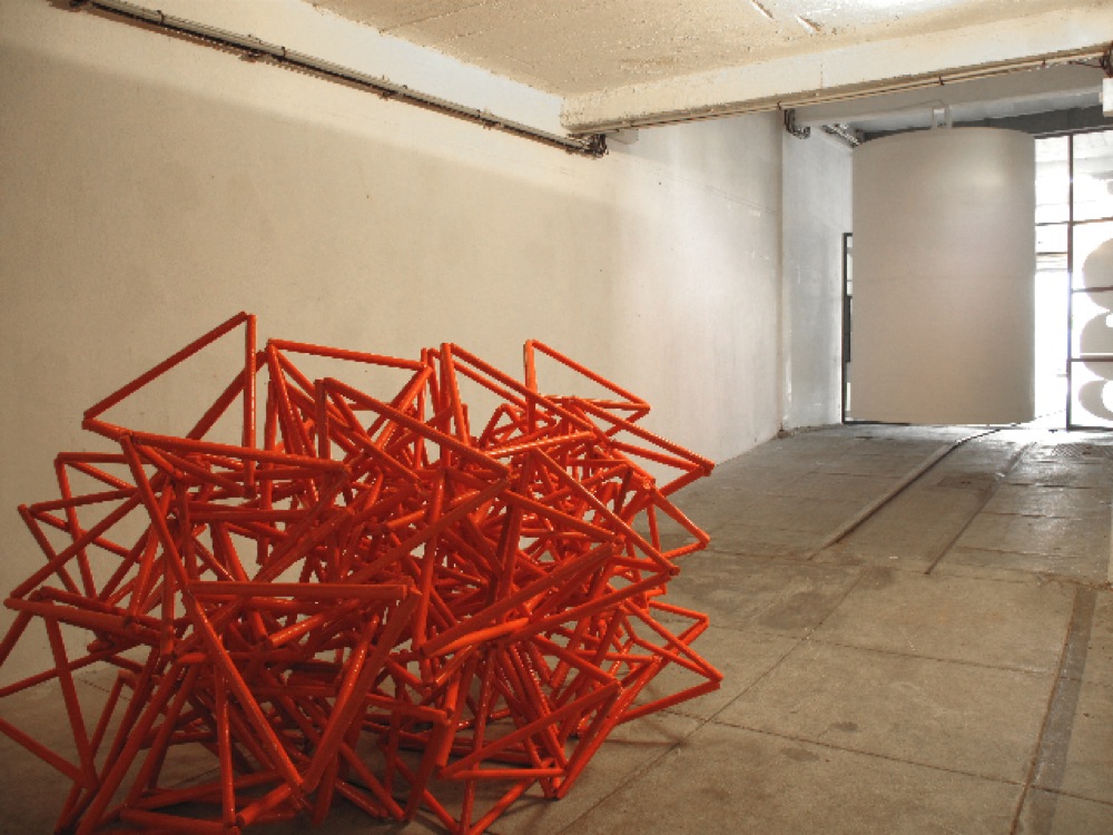 Elle se présente comme un volume (2,20m de large, 3,50m de long et 1,60m de haut) qui restitue la tension d’un espace rectangulaire basculant à la limite de la résistance. La construction tient compte des dimensions de l’espace environnant. Fortement étirée, elle semble vouloir rejoindre le mur de pierre à partir des deux colonnes situées à l’entrée de la galerie. Le basculement Accentue l’équilibre précaire du volume et tient compte du dénivelé du sol. La sculpture concentre ces différents mouvements.