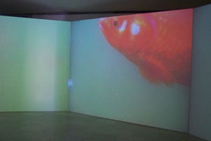 Lorsque l’on pénètre dans la pièce consacrée au dispositif subaquatique de Céleste Boursier Mougenot, une sensation d’immersion nous prend au dépourvu. D’immenses poissons rouges traversent l’écran et les tympans vibrent. L’apparition soudaine d’une de ces créatures aquatiques donne le la, puisqu’un long bourdonnement se fait entendre. Un son abyssal, une sorte de note profonde, étrange, presque musicale.