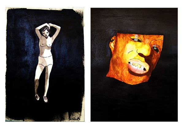 Les dessins - Tous ces dessins existent au moins depuis plus de 10 ans. Ils sont le résultat de mon désir de retour à la « peinture » par le biais du dessin. En dehors de la BD ou de mes travaux graphiques pour la presse, j’ai toujours eu l’envie de revenir aux sensations picturales que provoque l’acte de peindre et que j’avais connu du temps de l’école des Beaux Arts de la Villa Briguiboul à Castres. A l’époque, j’étais totalement fasciné par les monochromes bleus d’Yves Klein et l’art conceptuel. Évidemment mes premières tentatives de tableaux ont été infructueuses. Je n’avais rien à « montrer » picturalement dans cette direction. J’ai alors tout naturellement retrouvé le papier, l’art figuratif, la couleur et grâce aux questions que je m’étais posé, les premiers tableaux sont venus naturellement. Je repartais du monde moderne (l’imagerie scientifique, les photographies de mode, le cinéma…) et j’effectuais un retour en arrière en plongeant toute cette masse dans la matrice même de la peinture (de la couleur sur une surface). On perd certaines choses (le glamour, le futile ou l’abscons ) et l’on retrouve (du moins je l’espère) l’essence même d’une image : l’aura (concept cher à Walter Benjamin). Lorsque Julien m’a envoyé le premier collage mettant côte à côte une de ses photographies et l’un de mes dessins, j’ai trouvé ça superbe, le reste est venu naturellement. J’y ai vu comme une occasion unique de rassembler ce travail sur la figuration avant de repasser définitivement à la toile.