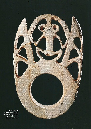 Matière d’exception, le bénitier fossile a donné naissance à des objets singuliers et éminemment précieux, prisés par les hommes de pouvoir en Mélanésie. Pour maintenir les prérogatives dues à leur position sociale, ces derniers se devaient d’afficher des insignes hors du commun. Contrairement aux sculptures en bois, le bénitier fossile résistant à la dégradation du temps, a favorisé pour de nombreuses générations, la donation de père en fils de ces biens inestimables, ce qui a contribué à alimenter le caractère divin de certains objets. Ces objets sont spécifiques à la Mélanésie (îles Salomon, Nord de la Papouasie et Vanuatu). La difficulté à l’époque d’acquérir de telles pièces s’est répercutée et amplifiée de nos jours. Cette pénurie explique pourquoi pendant longtemps ces objets furent ignorés des occidentaux et pourquoi aujourd’hui si peu de prototypes subsistent dans les collections.