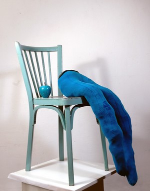 Ses créations deviennent des installations composites d’Anti-bustes et de meubles. Des Anti-bustes toujours et encore, les jambes croisées, assis sur des chaises, allongés sur des sofas, jambes serrées ou en contrapposto. Eve est là, toute entière symbolisée par la pomme, jambes moulées dans du lycra bleu sur une chaise bleue.