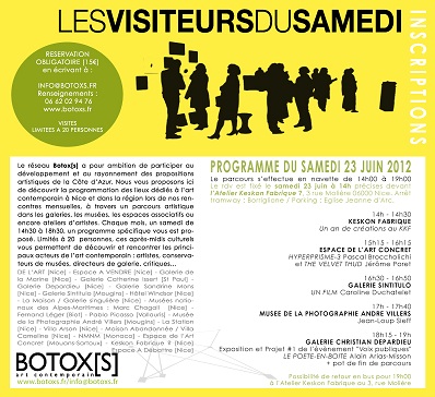 Les visiteurs du Samedi proposent un parcours le Samedi 23 juin 2012. Comme à leur habitude, ils vous feront découvrir de nombreuses expositions dans toute la ville de Nice. Des évènements assez prisés, mieux vaut réserver !