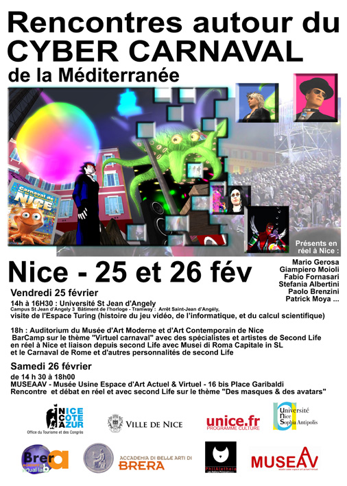 18h : auditorium du Musée d’Art Moderne de Nice, film et présentation de tous les participants sous forme de BarCamp sur le thème "Virtuel carnaval"