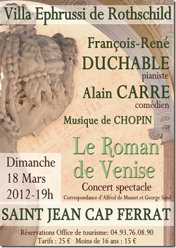 Comme « un frisson d’eau sur de la mousse », ces mots volés à Alfred de Musset illustrent le langage musical et littéraire imaginé par le pianiste François-René Duchâble et le comédien Alain Carré. Un spectacle ? Plutôt un climat qui, en quelques minutes, transporte l’auditeur dans l’univers feutré et brillant du XIXe siècle. Depuis le printemps de 1834, George Sand et Alfred de Musset vivent une passion amoureuse. Alain Carré lit quelques lettres des deux écrivains. Sa voix extraordinairement musicale colore les échanges des deux amants. Un échange littéraire sans sophistication, une prose poétique sans emphase pour exprimer les choses les plus simples à une époque où le romantisme faisait loi. Si la langue est admirable, la musique de Chopin sublime la passion houleuse qui anime Musset et