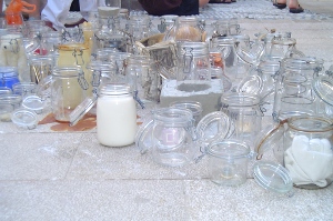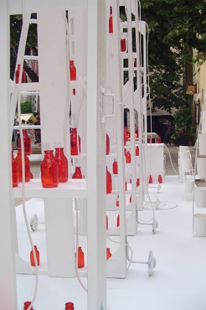« A la manière des particules élémentaires représentant les cellules les plus petites qui constituent l’ensemble de la matière de l’univers, les bocaux de l’installation Particules élémentaires se veulent la matière première de la constitution d’un esprit, par un ajout d’idées supplémentaires, indépendantes mais en interaction entre elles.