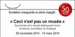 5 décembre 2014, par Paola Di LucaEn 2014, la Fondation Maeght a donné rendez-vous à tous les amateurs d’art pour fêter son cinquantenaire autour de trois temps forts. Pensé comme une exposition-mosaïque, le troisième et dernier rendez-vous rendra hommage aux dialogues entre les arts visuels et la danse, la littérature, la musique, le théâtre, via des archives sonores, photographiques et filmiques, et par la présentation d’œuvres mettant en regard ces différentes disciplines.