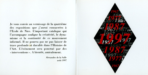 Chaque dix ans, c’est-à-dire à deux autres reprises successives, nous nous sommes penchés, Alexandre et moi, sur le destin du concept de l’Ecole de Nice. Ce concept, je l’avais affublé en 1967 d’un point d’interrogation, en 1977 d’un point d’exclamation, en 1987 de trois points de suspension : Ecole de Nice ? Ecole de Nice ! Ecole de Nice…