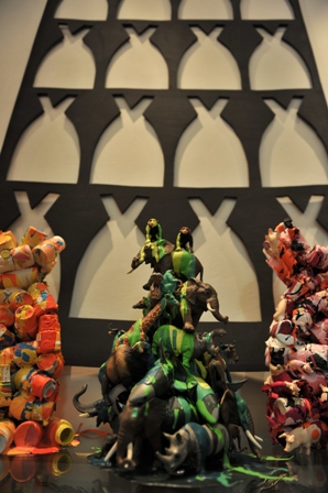 Ainsi à force de réflexion et de patience naquirent ces sculptures/peintures/accumulations évoquant un univers en prise avec l’actualité comme la série « Obama » composé de zèbres, où le noir et blanc renvoient à la manipulation médias/politique. Ou encore « The bad smell of human being » qui dénonce avec son amoncellement d’Action man « les dangers qu’il peut y avoir à laisser l’homme régner en maître absolu sur la planète ».