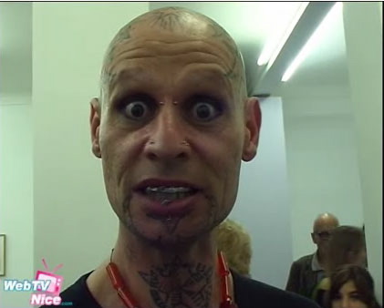 Le personnage s’impose immédiatement à nous : à l’évidence, c’est un artiste ! Mais quel artiste, où est l’œuvre, la réalisation plastique ? Le corps, la silhouette et la démarche en font partie intégrante. Le corps est lui-même une œuvre d’art par ses multiples tatouages comme les étoiles argentées en constellations, le regard illuminé par des lentilles rutilantes, les piercings qui ponctuent l’épiderme et les différentes interventions sur la peau, transformant la banalité en décor insolite.