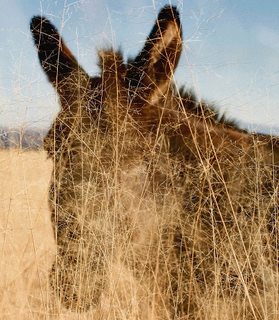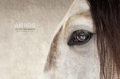 Cette photo de Jennifer Ajuriaguerra présente les « visages » de deux chevaux qui se rencontrent ; cette constatation est étayée par quelques signes de reconnaissances tels que les yeux, les oreilles, le crin ou la crinière qui montrent une référence explicite à la race chevaline. Mais ces éléments ne sont pas immédiatement identifiables en raison de leur présentation tronquée et l’hypertrophie due à l’effet de zoom.