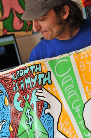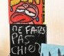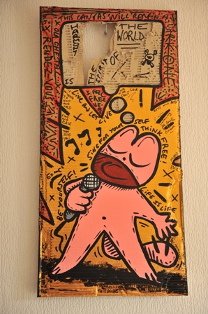 Il tente alors de concilier ces deux aspects en utilisant des techniques surréalistes d’écriture et de dessins spontanés. « Des automatismes psychiques, comme disait André Breton. Si les toiles sont surréalistes dans leur conception, elles donnent une place plus importante au verbe qu’au symbole. » Jusque sur la tranche, où Jérémy laisse s’exprimer son humeur du moment. Ecologie, crise financière, les grands thèmes qui font les titres des journaux d’aujourd’hui, il les exploite déjà. Jusqu’aux insultes.