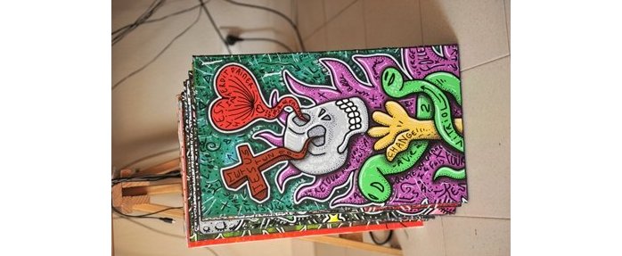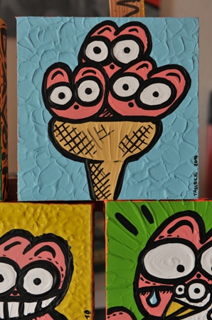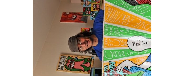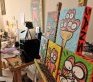 Au total, le chat rose compte une soixantaine de productions. Même si certaines sont parfois détruites pour donner naissance à d’autres. Car Jérémy Taburchi est un adepte du recyclage. Et des moyens du bord. Il n’a plus de toile ? Il peint sur un tapis ! Pas de pinceau ? Il peint son autoportrait à l’aide d’une carte de visite… Silicone, plâtre, Jérémy Taburchi s’adonne aussi aux essais de matières. En témoignent les créations hétéroclites et les taches de peinture qui jalonnent les murs et le sol de son petit atelier situé non loin de Monaco…