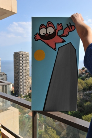 En attendant celle qui sera publiée en octobre prochain, avec Nice comme toile de fond du scénario, « une matière comestible que l’on peut tordre à merci », indique l’artiste qui y est né. Pour autant, le chat rose ne délivre pas de message général. « Le message ? Il existe toile par toile. Les petits formats naissent d’une bonne idée graphique, d’un concept ou d’une émotion. » En toute simplicité. Comme lorsqu’on voit le chat baver devant un petit oiseau dans une assiette. « Je devais avoir un peu la dalle à ce moment-là ! » Les formats plus grands, quant à eux, sont plus méditatifs. « Il me faut plus de place quand j’ai plus de choses à dire. »