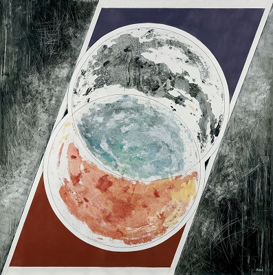 Références organiques, rapports aux éléments naturels, telles sont les tentatives que l’on peut percevoir dans ce travail de grande échelle. Les effets de matières transparentes sont dus aux procédés d’impression qui laissent la trace de l’outil effleurer la surface avec de multiples réserves de blanc. Les cercles entrelacés connotent les différents aspects de la terre, alors que les éléments qui la composent pourraient s’inspirer de leur inclinaison et de l’axe pivotant qui induit ici un mouvement de rotation. Mais tout cela n’impose pas une interprétation univoque, et laisse une totale ouverture au regard et à l’imagination : les imbrications de cercles et l’exaltation de la matière peuvent aussi bien conduire notre pensée vers des mondes inconnus ou des territoires inexplorés…sans s’arrêter obligatoirement à la vision cosmique proposée par le titre.