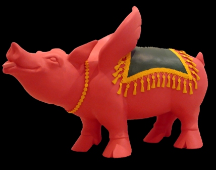 Le cochon ailé Pigasus Bollywood, les rois du Zo’os, les Punky Porcus sont ses chimères animalières pour signifier les parallèles possibles entre animaux et hommes. Mélange de cultures et d’origines, ses objets sont choisis en fonction de zébrures, transformés en tatouage pour son prochain projet animalier, le cheval géant.