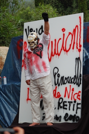 « mort aux vaches » et « love » et taggua « viva la revolucion ! ». Sa main gauche dans un gant noir, il leva le poing, en référence au Black Power, et baissa la tête. « Le 15 décembre, à la fin de l’exposition, je scellerai la mort de l’École de Nice pour qu’elle puisse entrer dans l’Histoire ». Pour lui, les meilleurs sont morts, ne restent que les