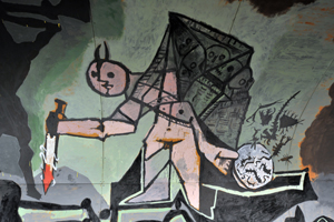 La Guerre, montée sur un char antique, déploie son cortège de malheurs, avant d’être arrêtée par la justice au bouclier orné de la célèbre colombe. On voit une boîte contenant des bactéries, en cette période de guerre de Corée, où les rumeurs de guerre bactériologique menée par les Américains allaient bon train. Tout le long de la peinture, en bas, on voit une bande de sang. Les guerriers portent des armes intemporelles comme des haches et des sabres. Mains coupées, maigres chevaux noirs, autodafés, moisson fichue… Le tableau parle de lui-même. Dans le bouclier du guerrier, on peut distinguer le visage de Françoise Gilot, sa compagne et mère de ses deux enfants, Claude et Paloma. La Paix associe la figure du funambule, qui exprime le fragile équilibre, à celle d’une famille qui, sous un oranger, jouit du bonheur calme de l’été. L’ensemble constitue un double manifeste, politique et esthétique. Des musiciens jouant d’une flûte antique font danser les femmes, tandis qu’un enfant se tient près d’une cage contenant des poissons et un bocal des oiseaux : cela pourrait signifier qu’en temps de paix, tout est possible. Et l’espoir aussi que la jeunesse ne reproduise pas les erreurs de ses aînés.