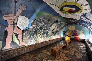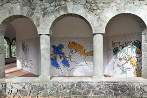 C’est en 1950 que, dans la chapelle du château de Vallauris, sont installées les deux œuvres La Guerre et La Paix. L’édifice ancien, daté entre la fin du XIIème et le début du XIIIème siècle, donne à cette œuvre tout son caractère sacré et universel, venant renforcer ses références à l’art antique et rupestre. La chapelle est un édifice à nef unique. Les pierres utilisées, de nature variée, lui confèrent des tons allant du gris au rose, en passant par l’ocre. L’église Sainte-Anne de Vallauris s’insère dans un ensemble de constructions en Provence orientale de style roman tardif. L’artiste a choisi cette église car, installé à Vallauris depuis 1948 et fait citoyen d’honneur en 1949, il était particulièrement choyé par les habitants de cette ville (qui y avaient célébré ses soixante-dix ans). C’est durant ce banquet donné en 1951 en son honneur que Picasso décida de décorer la voûte du vestibule attenant à cette chapelle. Restait à régler certains problèmes techniques : chaque panneau mesure 10 mètres de longueur sur 4,70 mètres de hauteur. Un menuisier local a donc été chargé de fixer sur la voûte en pierre une armature en bois destinée à recevoir les deux compositions de ce temple de la paix. La peinture des panneaux n’a pas été exécutée sur place mais dans l’atelier du Fournas, qui a dû être aménagé pour offrir un espace suffisant.