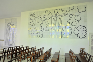 Un panneau représente Saint-Dominique, qui n’a pas de visage : il est tous les hommes du monde. Dans son vêtement, on distingue un M, qui peut vouloir dire aussi bien Marie que Matisse, qui n’a pas signé son œuvre. Le saint patron des dominicains se trouve ainsi face aux sœurs, priant avec elles dans le Christ, situé entre eux sur l’autel. « Nous prions dans un climat de beauté, c’est très important pour nous », explique l’une d’elles, Sœur Marie-Pierre. L’autel est d’ailleurs orienté à l’est, donc de biais, pour permettre au prêtre de voir les fidèles et les religieuses. Il est construit de trois blocs de pierres de Rogne, à l’aspect de pain, nourriture du corps et de l’esprit. La porte du tabernacle a été gravée par Matisse. Tabernacle qui fait corps avec la masse de l’autel et qui abrite le calice. Les chandeliers évoquent les corolles d’anémone, la fleur préférée de l’artiste. Le panneau à côté de celui de Saint-Dominique représente la Vierge et l’enfant. Ils inspirent la sérénité pour un recueillement dans la prière. Sur la droite du dessin, un seul trait suffit à écrire leurs corps. Une union parfaite. Pour Sœur Marie-Pierre, le « AVE » inscrit en haut à gauche veut aussi bien dire le nom de Dieu que « EVA », la nouvelle vie, nouvelle vie ou vie divine. Marie protège Jésus sans l’enfermer et lui-même accueille ses fidèles les bras grands ouverts. Une position qui n’est pas sans rappeler celle de la crucifixion. Le ton du panneau du fond, représentant la passion, est d’ailleurs tout à fait différent : la violence s’y ressent fortement, avec des lignes brisées qui contrastent avec la douce rondeur des céramiques. Tout en conservant leur individualité, l’artiste a fait de ces quatorze scènes un ensemble cohérent et ascendant, centré autour du motif principal : le Christ sur la Croix. À droite de l’entrée de la chapelle se trouve la porte du confessionnal, taillée dans un seul morceau de bois et directement inspirée des moucharabiés que Matisse a pu admirer au Maroc. À travers elle, les murs blancs semblent roses. « Tout est blanc et rien n’est blanc », disait l’artiste. En effet, par un jeu de lumières, c’est la couleur complémentaire du vert du vitrail d’en face qui se reflète sur le sol et les murs. Dans la galerie située derrière la chapelle, les chasubles des prêtres, dessinées par Matisse, sont exposées, ainsi que deux autres maquettes de la chapelle sur lesquelles il avait travaillé. « Mais elles invitent moins à la prière car elles sont d’un style moins épuré », commente Sœur Marie-Pierre. En effet, Matisse disait de sa chapelle qu’elle était un « grand témoignage calme du vrai ». Et il voulait que ceux qui entreraient dans sa chapelle « se sentent purifiés et déchargés de leurs fardeaux ».