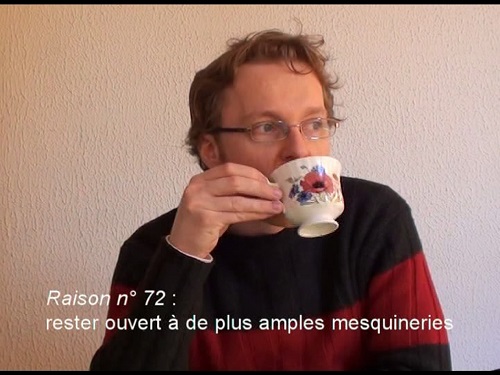 La Vidéo de David Christoffell le montre en train de boire le thé, de manger, de réfléchir pendant que des phrases s’inscrivent sur l’écran. Ses textes courts poético-philosophiques qu’il appelle : "raisons" (il y en a 1001 : "rester ouvert à de plus amples mesquineries", "laisser s’épanouir la grâce des autres", etc.), apparaissent comme autant de constats poétiques du temps qui passe. Les mots se lisent, confrontés au silence et à une vie qui se regarde vivre.