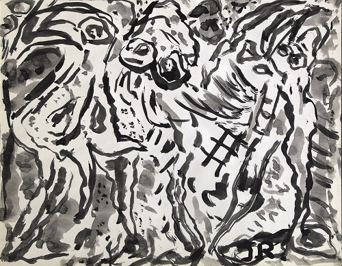 Jean Raine est écrivain, poète et peintre, membre historique du groupe Cobra, ami de Marcel Broothaers et d’Alechinsky avec qui il partage un graphisme libre, spontané, inspir ? des surréalistes.