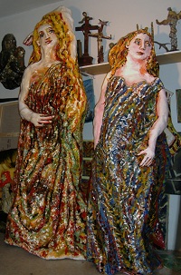 avons parlé. Tandis que les sculptures - et elles sont de taille ! - sont constituées de papier mâché pour l’extérieur, avec le plus souvent une armature de carton et de fer ainsi que de la résine et de la fibre de verre. Les matériaux les plus divers sont exploités, ainsi que les techniques traditionnelles.