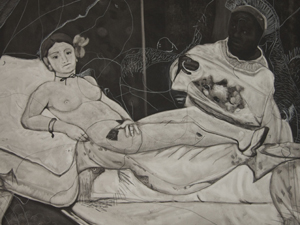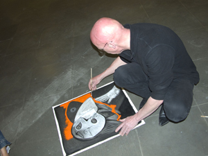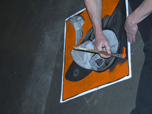 À partir d’une copie, l’artiste reproduit le dessin sur un fond noir, en lui rajoutant ses marques définitoires. À l’aide d’un pinceau, d’un cutter et d’une couleur forte, ses toiles deviennent des images en mouvement, qui cachent toujours le dessous de son imagination. « J’interviens dessus de trois façons différentes : une fois en grattant, une fois en rajoutant de la peinture et une fois en rajoutant des lettres ou des mots.