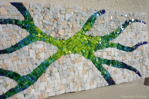 Dans la mosaique depuis plus de 10 ans, elle utilise de multiples techniques, la taille de la pierre, de la faience et du verre, la céramique, le modelage, le façonnage du verre au chalumeau. Ces sources d’inspiration vont du figuratif à l’abstrait. Attirée par les couleurs des matériaux, la transparence du verre et la texture de la terre, elle crée des tableaux, des sculptures, des objets, des mosaiques murales... Tout support est pour elle un prétexte !