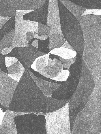 Les éclats sont ensuite ressoudés et ré-assemblés en de nouveaux amalgames ; la forme enfin éclot, et se fixe en unités compactes, aux imbrications symétriques (« Rythme diagonal » p. 40). C’est la naissance d’un répertoire de signes géométriques, aux contours vifs, aux couleurs contrastées ; pour la première fois, le treillis intégral fait place à une disposition flottante, qu’accentue le positionnement oblique des éléments.