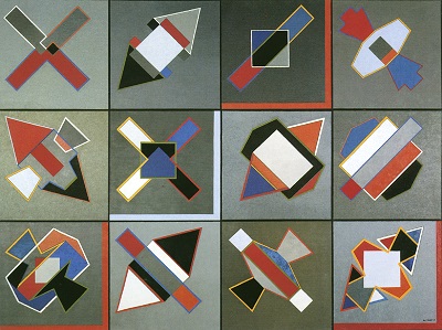 Sans se référer à la nature, Maggy Kaiser compose des « paysages » abstraits de triangles et trapèzes, les valeurs colorées seules donnent de la profondeur à ses compositions.